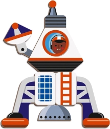 Im Set enthalten sind 52 magnetische Teile und 18 Karten mit Vorlagen von Raumfahrzeugen. Kinder können nach den Karten bauen oder eigene Kombinationen kreieren. Die Magnete lassen sich auch auf anderen Magnettafeln oder magnetischen Oberflächen verwenden.