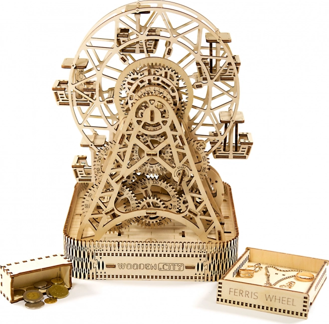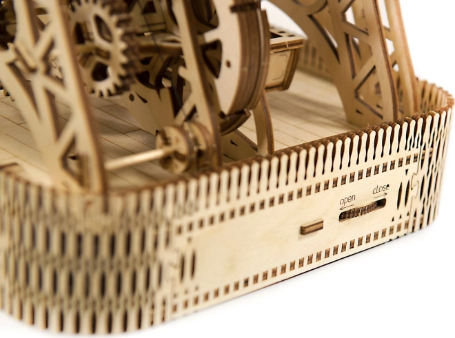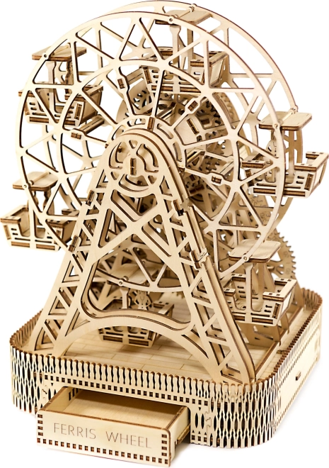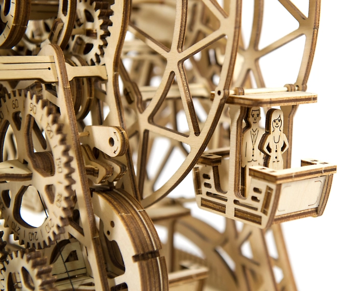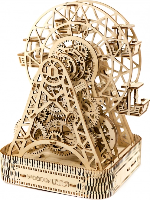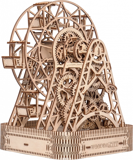 Treten Sie ein in die Welt des Vergnügungsparks mit dem WOODEN CITY Riesenrad, das mit unglaublichen Details und mechanischen Funktionen beeindruckt. Dieses durch einen Gummibandmotor betriebene Rad bietet ein einzigartiges Bewegungserlebnis und überrascht mit einer versteckten Schatulle.