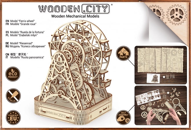 Holzmodell des Riesenrads von WOODEN CITY ist ein großartiger mechanischer Bausatz, der es Ihnen ermöglicht, ein eigenes ikonisches Fahrgeschäft mit drehenden Teilen und versteckten Überraschungen zu schaffen.