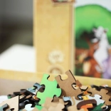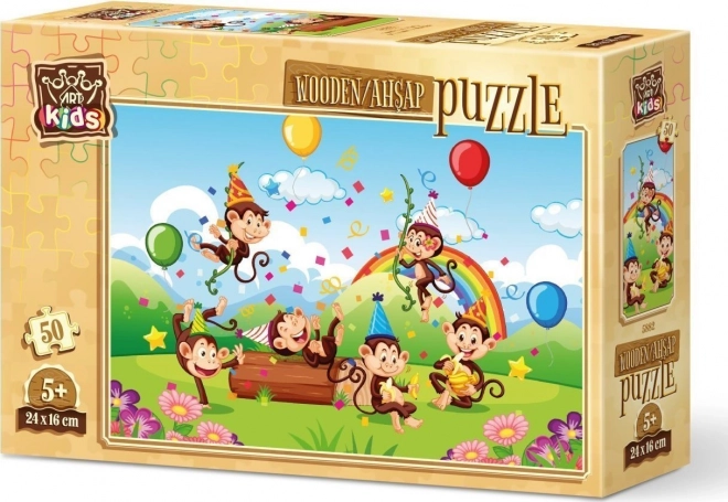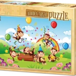 Genießen Sie ein hochwertiges Holzpuzzle mit fröhlichem Motiv einer Affenparty. Die Teile sind aus elastischem afrikanischem Holz gestanzt, wodurch sie robust sind und gut ineinander greifen. Das Puzzle ist perfekt zur Förderung der Feinmotorik, Logik und Geduld.