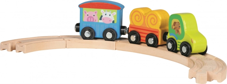 Hergestellt aus massivem Holz, verbunden durch Magnete, mit Kunststoffrädern, verwendete Farben sind gesundheitlich unbedenklich, leicht zu greifen, Maße: 28 x 4 x 5,5 cm.