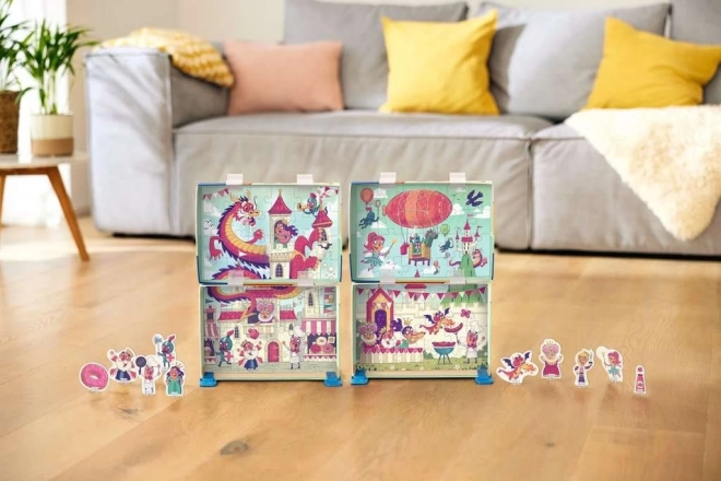 Zum Lieferumfang gehören außerdem Befestigungsklammern und Spielfiguren, mit denen Kinder die Szene beleben können. Gepuzzelt wird direkt in der Box, die als Hintergrund für das Theater dient – praktisch, unterhaltsam und ideal für unterwegs.