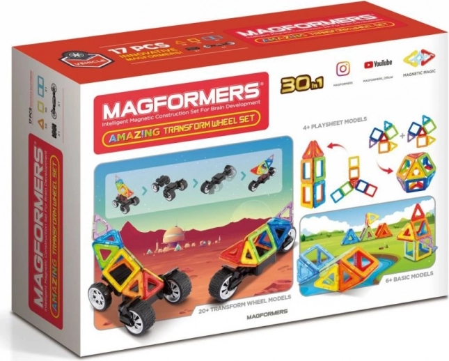 Viel Spaß mit dem Transform Wheel Buggy von Magformers. Das kreative magnetische Konstruktionsset ermöglicht das Bauen zahlreicher dreidimensionaler Objekte mithilfe zweidimensionaler Kunststoff-Polyeder. Magformers trainiert die Feinmotorik, fördert die Kreativität und bringt Kindern Farben sowie grundlegende geometrische Formen näher. Die Abmessungen der Teile und die sorgfältig gewählten Formen gewährleisten maximale Sicherheit des Spielzeugs. Das Material, aus dem das Set gefertigt ist, erfüllt die strengsten hygienischen und gesundheitlichen Kriterien. Die Teile sind ausreichend groß, können nicht verschluckt werden und sind praktisch unzerbrechlich. Lieferumfang: