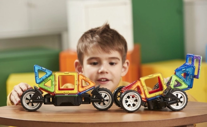 Eines der speziellen Fahrgestelle ist mit massiven Rädern ausgestattet, die sich unabhängig voneinander bis zu 90° drehen lassen, sodass es sich sowohl für einspurige als auch zweispurige Fahrzeugmodelle eignet. Das zweite Fahrgestell ist eine klassische Achse mit zwei verbundenen Rädern; hier können drei unterschiedliche Höhenpositionen der Verbindungsplatte eingestellt werden – ideal für wagemutige Karosserien von Quads und Buggys. In Kombination mit beliebigen weiteren Magformers-Teilen wachsen Vielfalt und Größe der Fahrzeuge um ein Vielfaches. Die meisten der hunderten aus diesem Set gebauten Autos und Motorräder sind überraschend robust und können daher problemlos auch als funktionsfähige Spielzeuge eingesetzt werden. Geeignet für Kinder ab 3 Jahren.