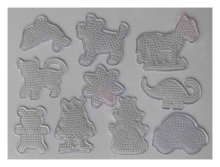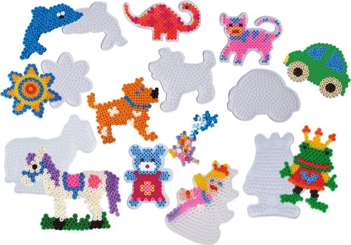 Perlenfieber! Kunststoff-Unterlagen zum Gestalten von Kunstwerken aus Bügelperlen. Die Platten sind transparent, sodass darunter eine Vorlage platziert werden kann (nicht im Lieferumfang enthalten). Verpackungsinhalt: 10 Schablonen in Form von Figuren, Tieren und Gegenständen