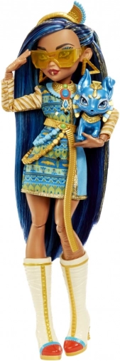 Cleo De Nile aus der Monster High Kollektion glänzt in einem ikonischen Outfit, inspiriert vom Alten Ägypten: blau-goldenes Kleid mit ärmeln in Verbandsoptik, ergänzt durch einen Kettengürtel und kniehohe Stiefel. Goldschmuck und stylische Sonnenbrille runden den Look ab.