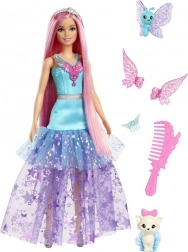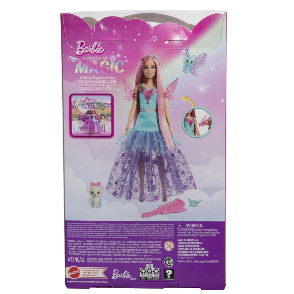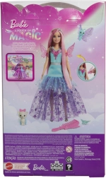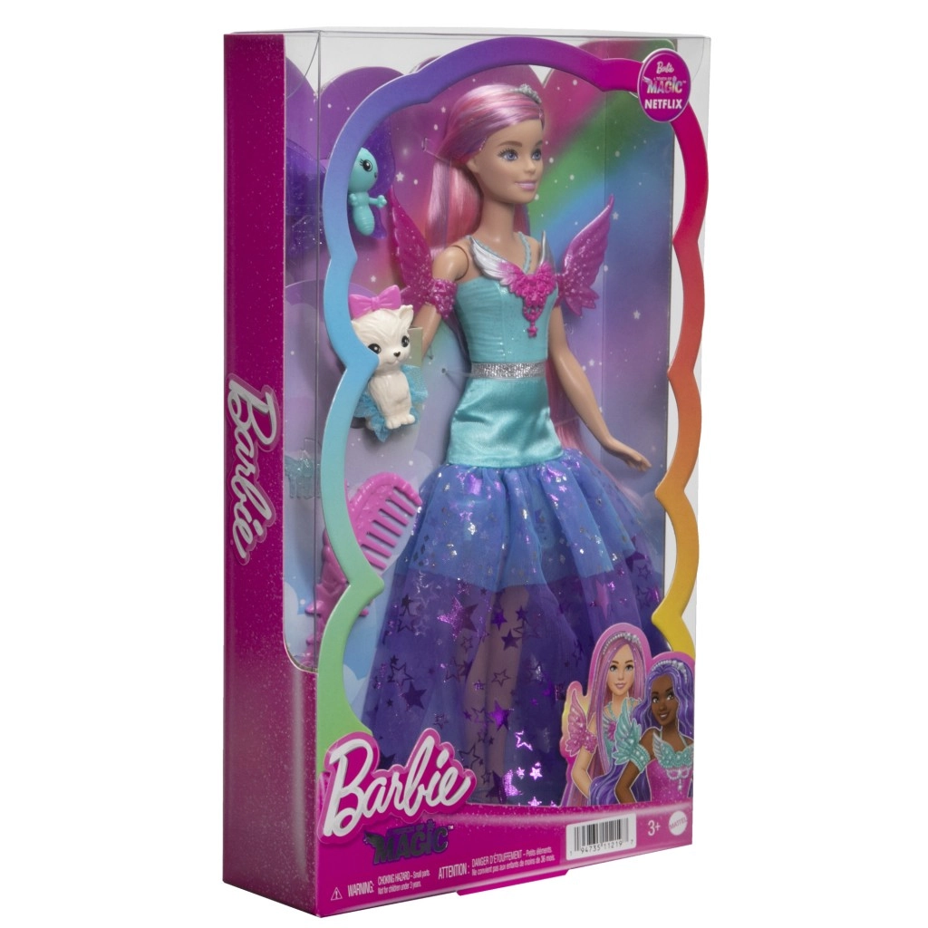 Die Barbie Malibu aus der Kollektion „Barbie und ein Hauch von Magie“ erstrahlt in einem wunderschönen Kleid mit Sternen-Tüll, einem glitzernden Haarreifen und abnehmbaren Flügeln. Pastellrosa Haare laden zum Kämmen und Stylen ein, während die niedlichen Freunde – ein Schmetterling und ein Tierchen im Tutu – Fantasie und Rollenspiel fördern.