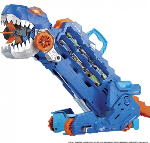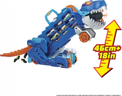 Der einzigartige Dinosaurier-Transporter kombiniert ein Staufach für mehr als 20 Metallfahrzeuge mit actionreichem Spiel. Im Transportmodus reicht ein Zug am Griff, und der T‑Rex „verschlingt“ die Autos auf seinem Weg. Mit einer einzigen Schwanzbewegung verwandelst du ihn in einen mechanischen T‑Rex mit Lichteffekten und Dinosauriersounds.
