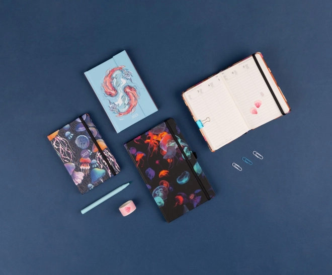 Format 13 × 21 cm, elastisches Gummiband für sicheres Schließen und praktische Stiftschlaufe – ideal zum Arbeiten überall.