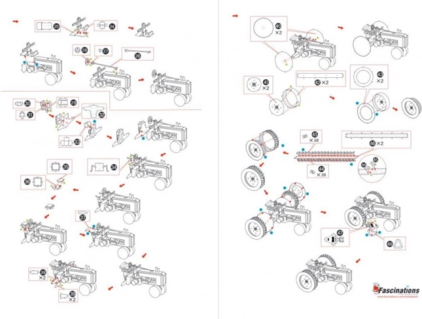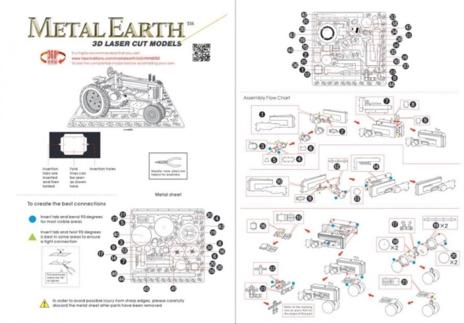 Entnehmen Sie die einzelnen Teile den Metallblechen; bei Bedarf verwenden Sie kleine Seitenschneider (nicht enthalten). Die Teile werden mittels Verriegelungen verbunden, die aus einem Haken (Nase) und einer Öffnung bestehen. Biegen Sie die Nase mit einer kleinen Flachzange (nicht enthalten) um und verbinden Sie nach und nach alle Verriegelungen, bis ein äußerst realistisches Meisterstück entsteht!