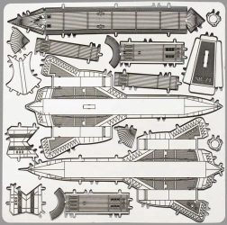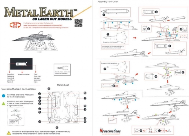 Entnehmen Sie die einzelnen Teile aus den Metallplatten; bei Bedarf verwenden Sie einen kleinen Seitenschneider (nicht enthalten). Die Teile werden mittels Laschen und entsprechenden Öffnungen verbunden. Biegen Sie die Laschen mit einer kleinen Flachzange (nicht enthalten) um und verbinden Sie nach und nach alle Verbindungen, bis ein äußerst realistisches Meisterstück entsteht!