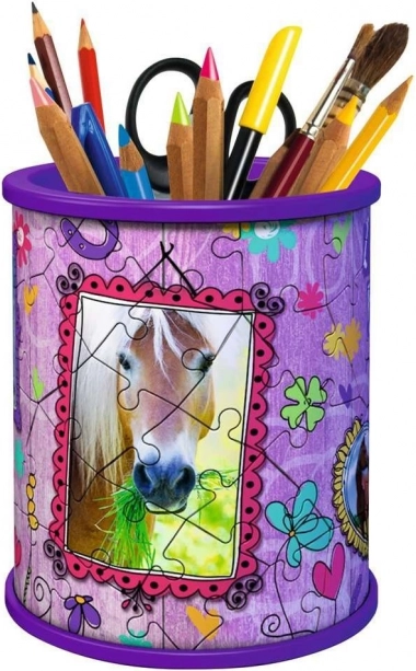 Entdecken Sie ein unterhaltsames 3D-Puzzle, das sich nach dem Zusammenbau in einen praktischen Halter für Stifte, Pinsel oder Kosmetik verwandelt. Speziell gebogene, hochwertige Kunststoffteile von RAVENSBURGER rasten passgenau ein und sorgen für eine feste Konstruktion ganz ohne Klebstoff. Das Pferdemotiv begeistert alle Tierfreunde und verleiht dem Schreibtisch einen individuellen Stil.