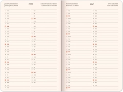 Das wöchentliche Spaltenlayout bietet ausreichend Platz für Notizen an jedem Tag. Im Kalender finden Sie eine Übersicht internationaler Feiertage, eine Liste tschechischer und slowakischer Namen, die Jahresübersichten 2024 und 2025, ein praktisches Adressverzeichnis sowie ein Einsteckfach auf dem hinteren Vorsatz für Kleinigkeiten.