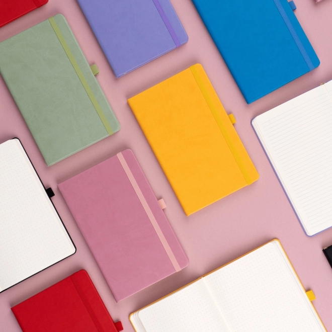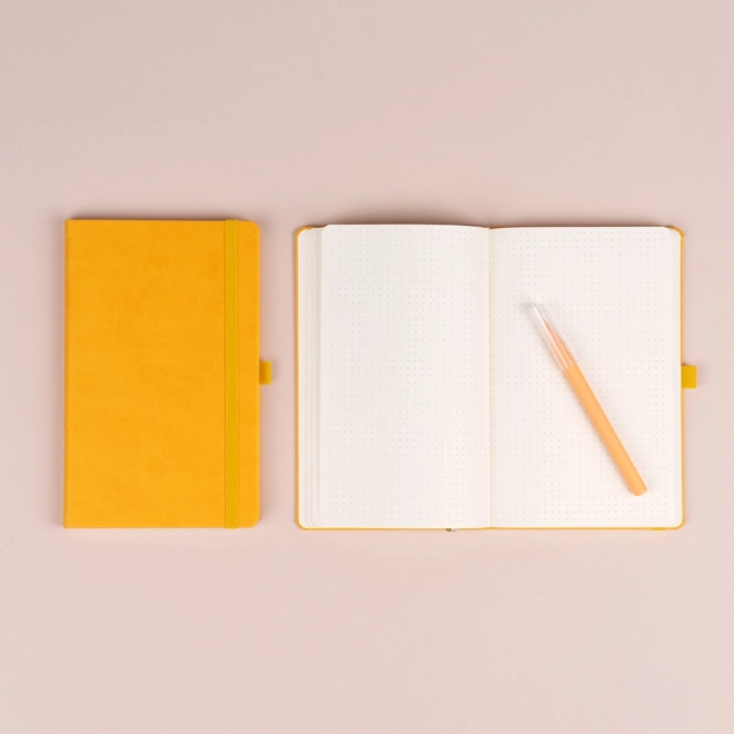 Praktisches und leichtes gepunktetes Notizbuch in trendigem Gelb mit einer fein strukturierten Oberfläche, auf der das Firmenlogo geprägt werden kann. Das Notizbuch hat eine feste Buchbindung und abgerundete Ecken, eine Stiftschlaufe, ein elastisches Gummiband und ein Textil-Lesezeichen. Die Punkte haben 5 mm Abstand und befinden sich auf hochwertigem gelbem Papier.
