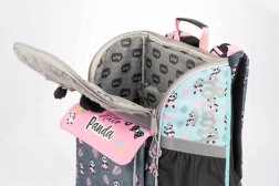 Das Klappöffnungssystem ermöglicht schnellen Zugriff auf Bücher direkt von der Schulbank. Innen gibt es eine transparente Tasche mit Stundenplan und einen Organizer mit Gummiband für eine gleichmäßige Gewichtsverteilung.