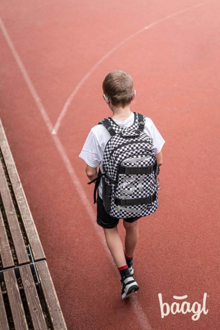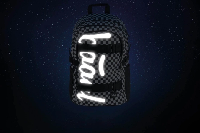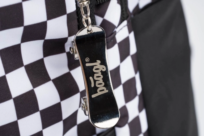 Schwarz‑weißes Schachbrettmuster mit reflektierenden Elementen für Sicherheit sowie ein zusätzlicher Metallanhänger.