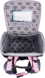 Das aufklappbare Öffnungssystem ermöglicht den direkten Zugriff auf den Inhalt von der Schulbank aus. Innen befinden sich ein Organizer mit Gummiband, ein transparentes Fach für den Stundenplan und ausreichend Platz für Bücher und Pausenbrot.