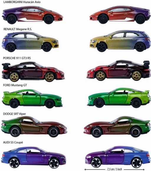 Wählen Sie aus PORSCHE 911 GT3 RS, LAMBORGHINI HURACÁN, AUDI S5 COUPÉ, FORD MUSTANG GT, DODGE SRT VIPER und RENAULT MEGANE R.S. – jeweils in attraktiven Farbtönen und mit Color‑Changers‑Effekt.