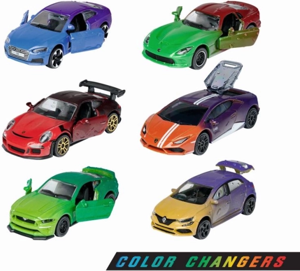 Diese detailreich gestalteten Autos bieten den einzigartigen Color‑Changers-Effekt: Beim Abkühlen auf ca. 10 °C wechseln sie die Farbe, beim Erwärmen auf etwa 22 °C kehren sie zum ursprünglichen Farbton zurück. Jedes Modell besteht aus Metall mit Kunststoffteilen, hat Freilauf, öffnende Teile und gefederte Räder für eine sanftere Fahrt.