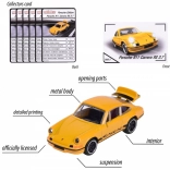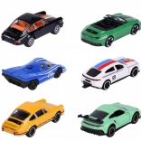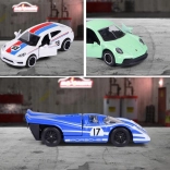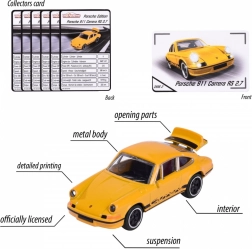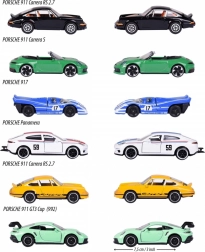 In der Edition finden Sie einen Mix aus sechs legendären Fahrzeugen: Porsche 911 Carrera S (grün), Porsche 917 (blau), Porsche 911 Carrera RS 2.7 (schwarz und gelb), Porsche 911 GT3 Cup (992) (türkis) und Porsche Panamera (weiß). Der Packungsinhalt ist zufällig – ein konkretes Modell kann nicht ausgewählt werden. Jedes Auto ist etwa 7,5 cm lang und wird durch eine Sammlerkarte mit Informationen wie Geschwindigkeit und Zylinderzahl ergänzt.