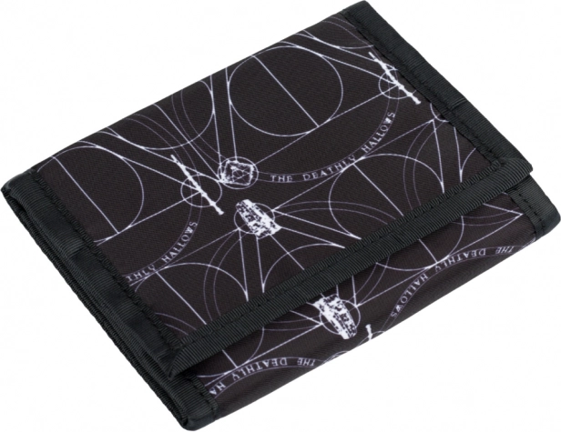 Stilvolle Geldbörse im Harry-Potter-Stil mit dem Motiv Heiligtümer des Todes, ideal für Fans der Serie. Hergestellt aus robustem Textilmaterial mit praktischem Klettverschluss.