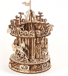 Ornamentale Lasergravuren, Naturholz und das klassische Karussellmotiv machen daraus einen Blickfang für Vitrine oder Kinderzimmer.