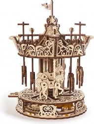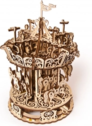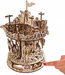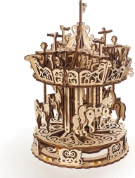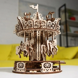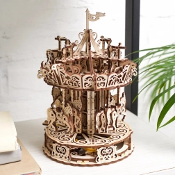Gönnen Sie sich ein elegantes Karussell aus hochwertigem Sperrholz, das Nostalgie mit raffinierter Mechanik verbindet. Dank des Gummi-Aufziehantriebs drehen sich Mittelstütze und Dach in entgegengesetzte Richtungen und erzeugen so eine optische Illusion hoher Geschwindigkeit. Die Pferde steigen sanft auf und ab, und über dem Karussell kreisen kleine Vögel – all das ist durch das offene Design wunderbar sichtbar.