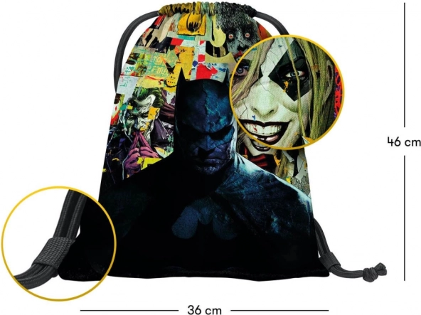 Die Tasche ist mit einem faszinierenden Grafikdesign versehen, das intensive Illustrationen von Batman und bunten Figuren und Symbolen zeigt.
