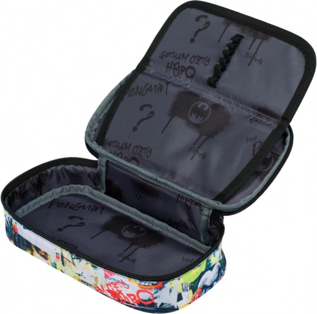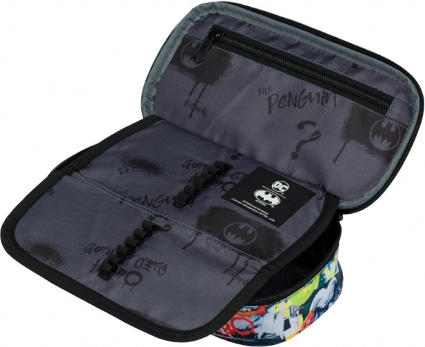 Dieses Schulmäppchen mit Batman Comics Motiv bietet originelle Comic-Muster, die alle Superhelden-Fans begeistern. Es ist mit einer aufklappbaren Innentrennwand ausgestattet, die eine einfache Organisation ermöglicht. Ebenfalls enthalten ist eine Innentasche mit Reißverschluss und ein spezielles Fach für den Stundenplan, was seine praktische Verwendbarkeit erhöht. Das Mäppchen ist aus Textilmaterial gefertigt, was ihm Leichtigkeit und Haltbarkeit verleiht.