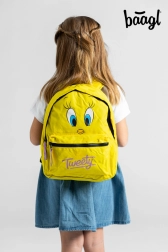 Der Rucksack besticht durch seine leuchtend gelbe Farbe mit Tweety-Motiv, was für kleine Kinder attraktiv ist.