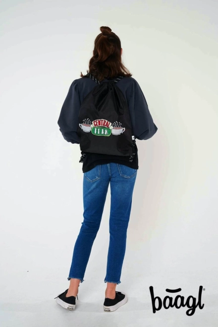 Eleganter schwarzer Beutel mit 'Central Perk' Logo ist eine großartige Wahl für Fans der Serie Friends. Perfekt zum Transport persönlicher Gegenstände.