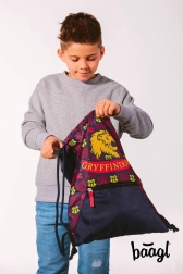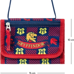 Zum Set gehören außerdem ein einlagiges Federmäppchen mit zwei Klappen (ohne Inhalt), ein Beutel für Sport/Hausschuhe mit vorderer Reißverschlusstasche und Kordelzug zum Tragen auf dem Rücken, eine Heftmappe mit Innenklappe und Gummiband sowie eine Halsgeldbörse mit Klettverschluss und Münzfach. Alles im Gryffindor-Design für einen stylischen Schulstart.