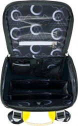 Die praktische aufklappbare Öffnung ermöglicht den Zugriff auf den Inhalt direkt vom Tisch. Innen finden Sie eine transparente Tasche für den Stundenplan und einen Organizer mit Fixiergummi für die übersichtliche Aufbewahrung von Büchern und Heften. Die isolierte Fronttasche mit Schnalle schützt das Pausenbrot, seitliche Netztaschen fassen eine Trinkflasche. Robuste wasserabweisende Materialien, ein standfestes Bodenfach und reflektierende Elemente erhöhen Langlebigkeit und Sicherheit auf dem Schulweg.