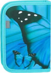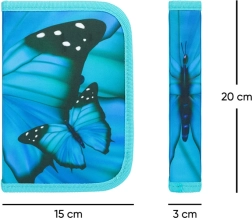 Elegantes Mäppchen in Türkis mit auffälligem Schmetterlingsmotiv, das Stil und Funktionalität verbindet. Dank zwei Innenklappen, Gummischlaufen und Fächern sind Schreibwaren und kleine Schulutensilien stets übersichtlich verstaut und per Reißverschluss sicher verschlossen.
