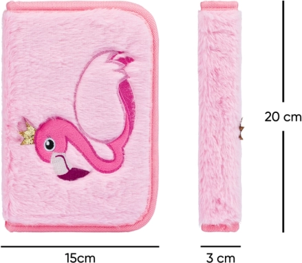 Praktisches und stylisches Schulmäppchen mit Flamingo-Motiv überzeugt durch seine weiche Oberfläche und die durchdachte Aufteilung. Das einlagige Design mit zwei Klappen ermöglicht die übersichtliche Aufbewahrung von Schreibutensilien, Lineal und kleinem Schulzubehör. Ein robuster Reißverschluss sorgt für zuverlässiges Schließen und leichtes Öffnen.
