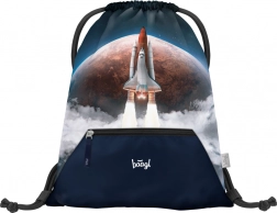 Beutel für Schuhe Space Shuttle ist aus robustem, abwaschbarem Material hergestellt, hat eine praktische Reißverschlusstasche und einen Karabiner zur Befestigung beispielsweise am Ranzen. Er wird dank der festen Kordeln bequem auf dem Rücken getragen.