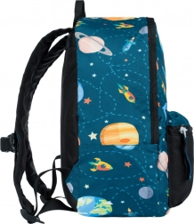 Das bezaubernde Motiv mit Planeten und Raketen werden Kinder lieben. Das Hauptfach fasst die Brotzeit und das Lieblingsspielzeug. Die vordere Reißverschlusstasche ist ideal für Kleinigkeiten, Taschentücher oder Schlüssel.