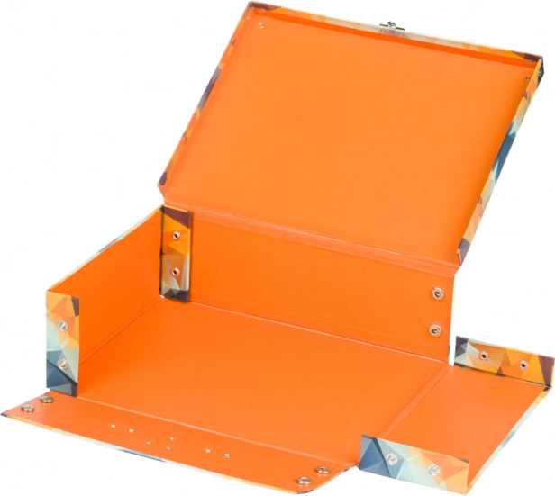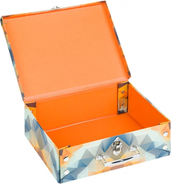 • Faltbarer Koffer aus stabilem laminiertem Karton mit verstärkten Metallecken.