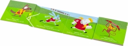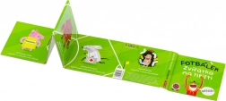 Leporello für die Kleinsten, das einen lustigen und farbenfrohen Blick auf ein Fußballspiel zwischen Tieren auf dem Spielfeld bietet. Ideal für neugierige Kinder.