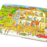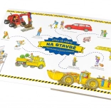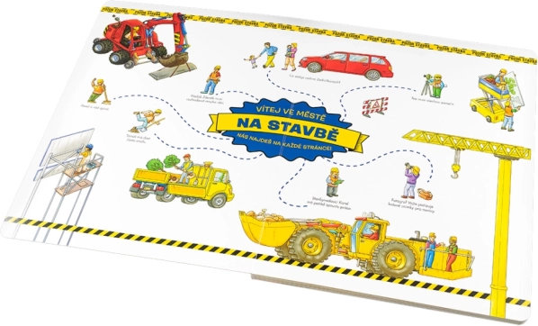 In der Stadt ist immer etwas los – es wird gegraben, repariert, gebaut und verschönert. Kinder suchen auf den Seiten nach Lastwagen, Betonmischern, Baggern, Kränen oder Gabelstaplern, lernen die Arbeit der Handwerker kennen und sehen, wie Vorarbeiter und Bauleitung alles im Blick behalten. Auch Architekt, Fotograf und Gärtner fehlen nicht – dazu viele Figuren mit eigenen Mikrogeschichten. Dieses Kinderbuch über die Baustelle ist ein großartiges Such- bzw. Wimmelbuch, das Ausdrucksfähigkeit und Aufmerksamkeit ganz natürlich fördert.