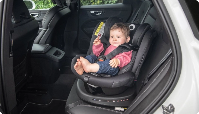 Mit einer Hand drehen Sie den Sitz zur Tür, sichern das Kind bequem und wählen je nach Bedarf die Fahrtrichtung. Komfort und Sicherheit im täglichen Gebrauch.