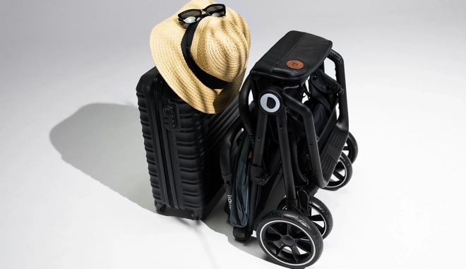 Das XXL-Verdeck mit wasserabweisender Beschichtung und UPF50+ Filter bietet zuverlässigen Schutz vor Sonne und Regen. Für Sicherheit sorgen 5-Punkt-Gurte und reflektierende Elemente für bessere Sichtbarkeit. Auf Knopfdruck klappt der Kinderwagen automatisch zu einem kompakten Format zusammen – der Transport gelingt leicht mit dem speziellen Tragegurt und der Schutzhülle.