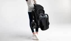 Mit einem Knopfdruck lässt sich der Kinderwagen zu einer kompakten Form zusammenklappen und dank Trageriemen bequem über der Schulter tragen – ideal für die Stadt und auf Reisen.
