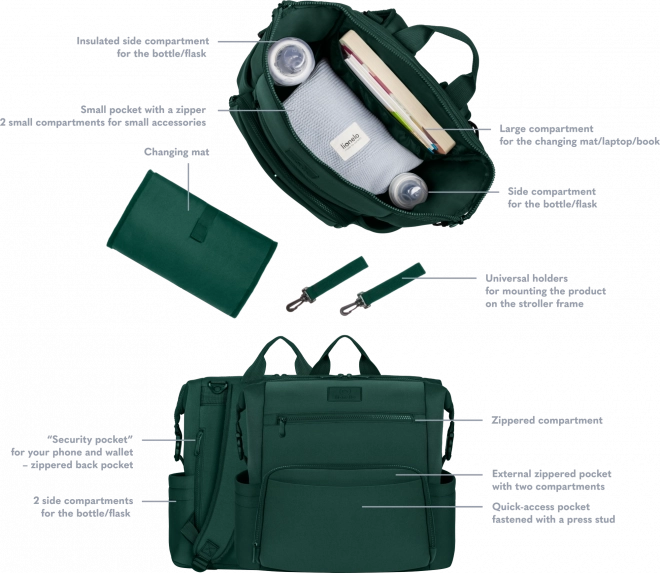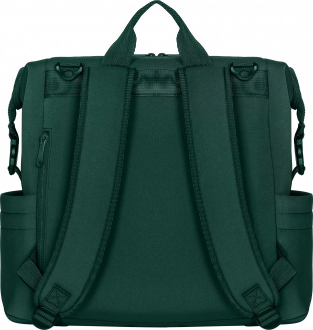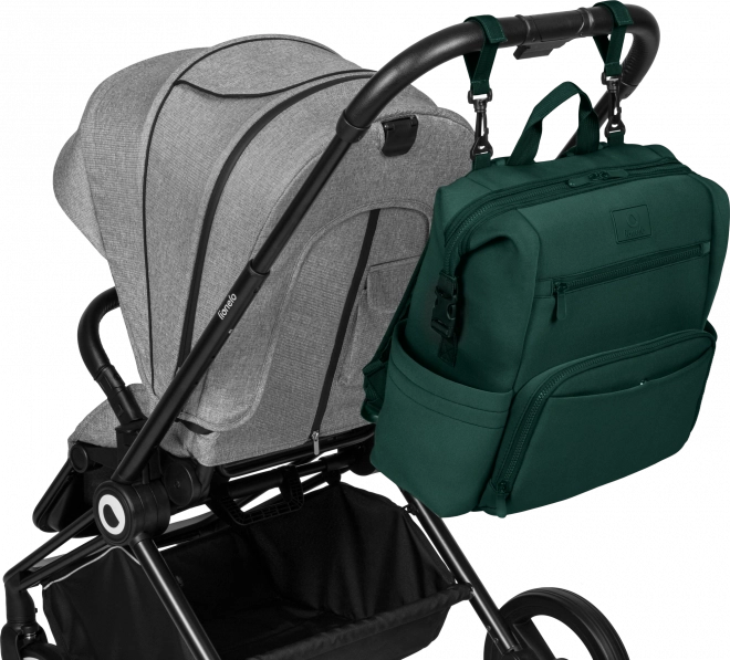 Der Rucksack kann auf dem Rücken getragen, mit abnehmbaren, universellen Gurten am Kinderwagen befestigt oder als eigenständiges Accessoire verwendet werden. Die Wickeltasche dient auch als Fach für Tablet oder Laptop, während Seiten- und Innentaschen alles griffbereit halten. Mit den Gurten lässt sich die Größe reduzieren, sodass der Rucksack unter den Flugzeugsitz passt.