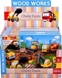 Buntes Kinder Holzpuzzle mit dem Motiv von Verkehrsfahrzeugen. Hilft, die Aufmerksamkeit, Fantasie und das Gedächtnis der Kinder zu entwickeln.