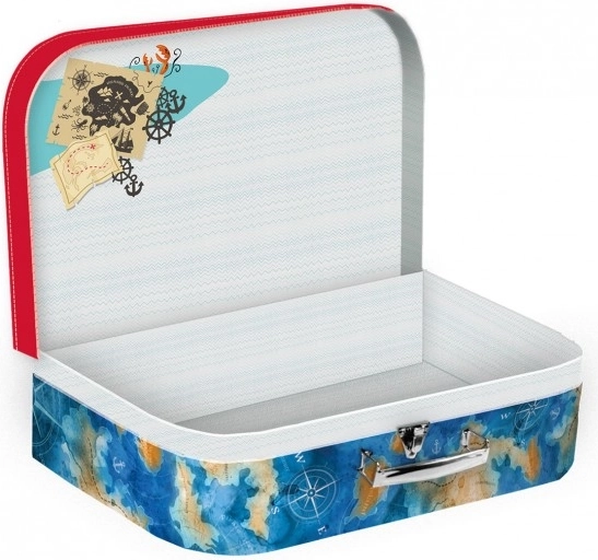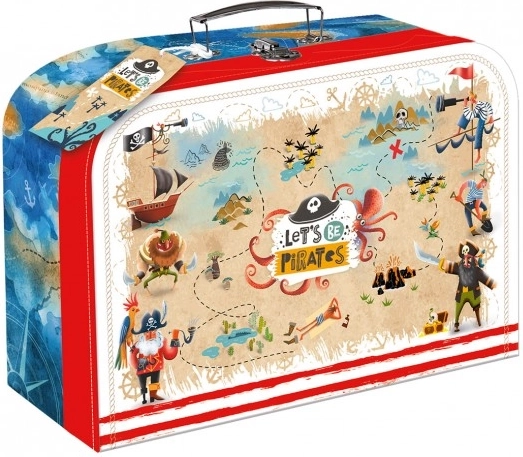 Hochwertiger Kinderkoffer mit Piratenmotiv, ideal für Schulsachen. Hergestellt aus hartem Karton und durch Laminierung für längere Haltbarkeit geschützt.