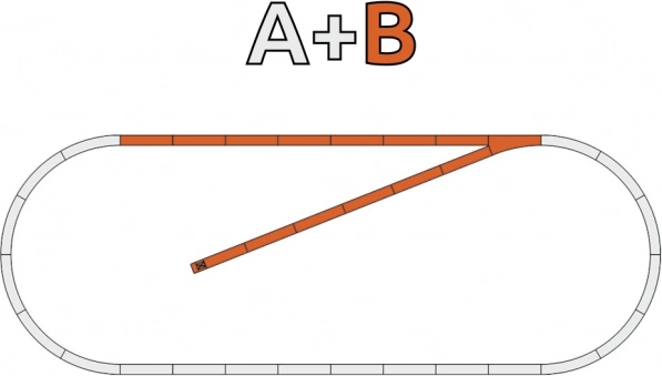 Hinweis: Für den vollständigen Aufbau gemäß dem Beispielplan wird das Grundoval mit Bettung (A) benötigt – 12× Bogen R3 (61123) und 8× Gerade G200 (61110). Für einen störungsfreien Betrieb beachten Sie die Übereinstimmung der Radsätze mit der Norm NEM 311.
