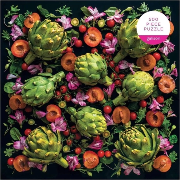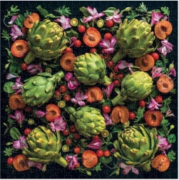 Genießen Sie ein ästhetisches Erlebnis mit einem Motiv der berühmten Feinschmeckerin und Fotografin Sarah Phillips, der Initiatorin des Projekts Ugly Produce is Beautiful. Der Kontrast des schwarzen Hintergrunds mit den lebendigen Tönen grüner Artischocken, rubinroter Tomaten und violetter Blüten schafft ein eindrucksvolles Bild, das sowohl beim Puzzeln als auch gerahmt zur Geltung kommt.