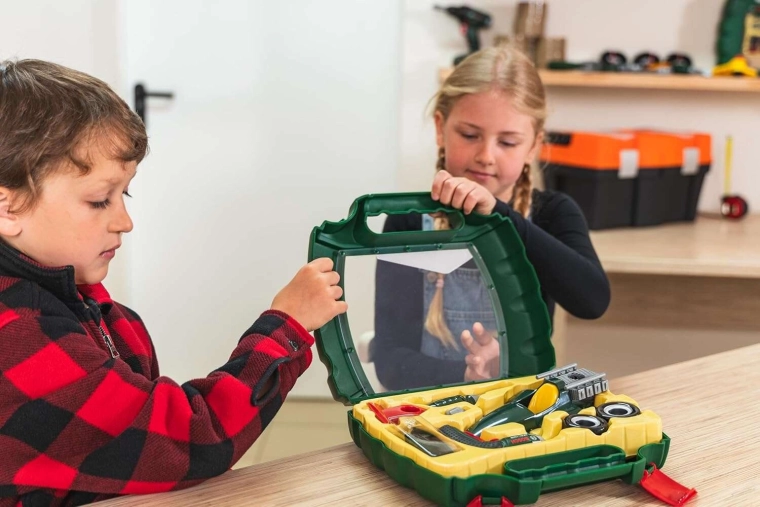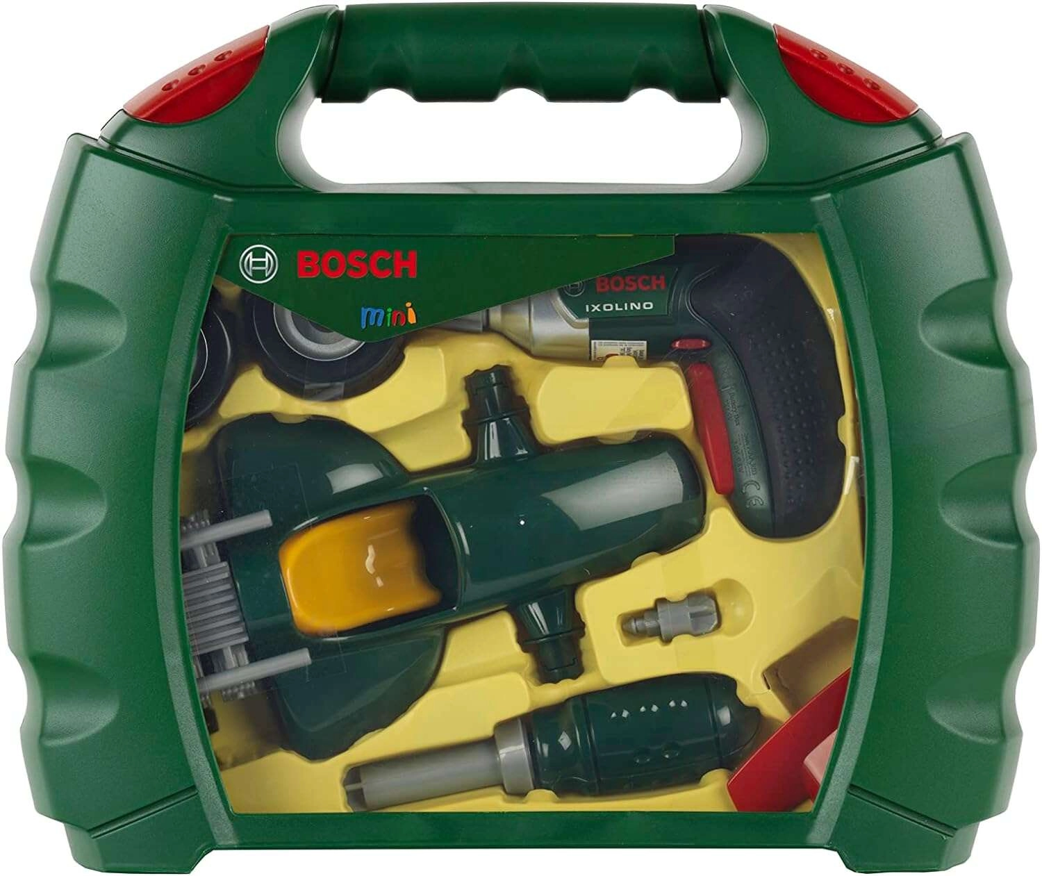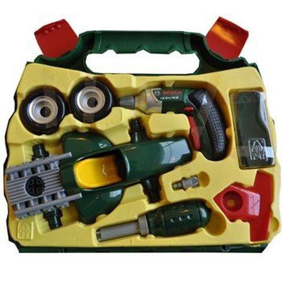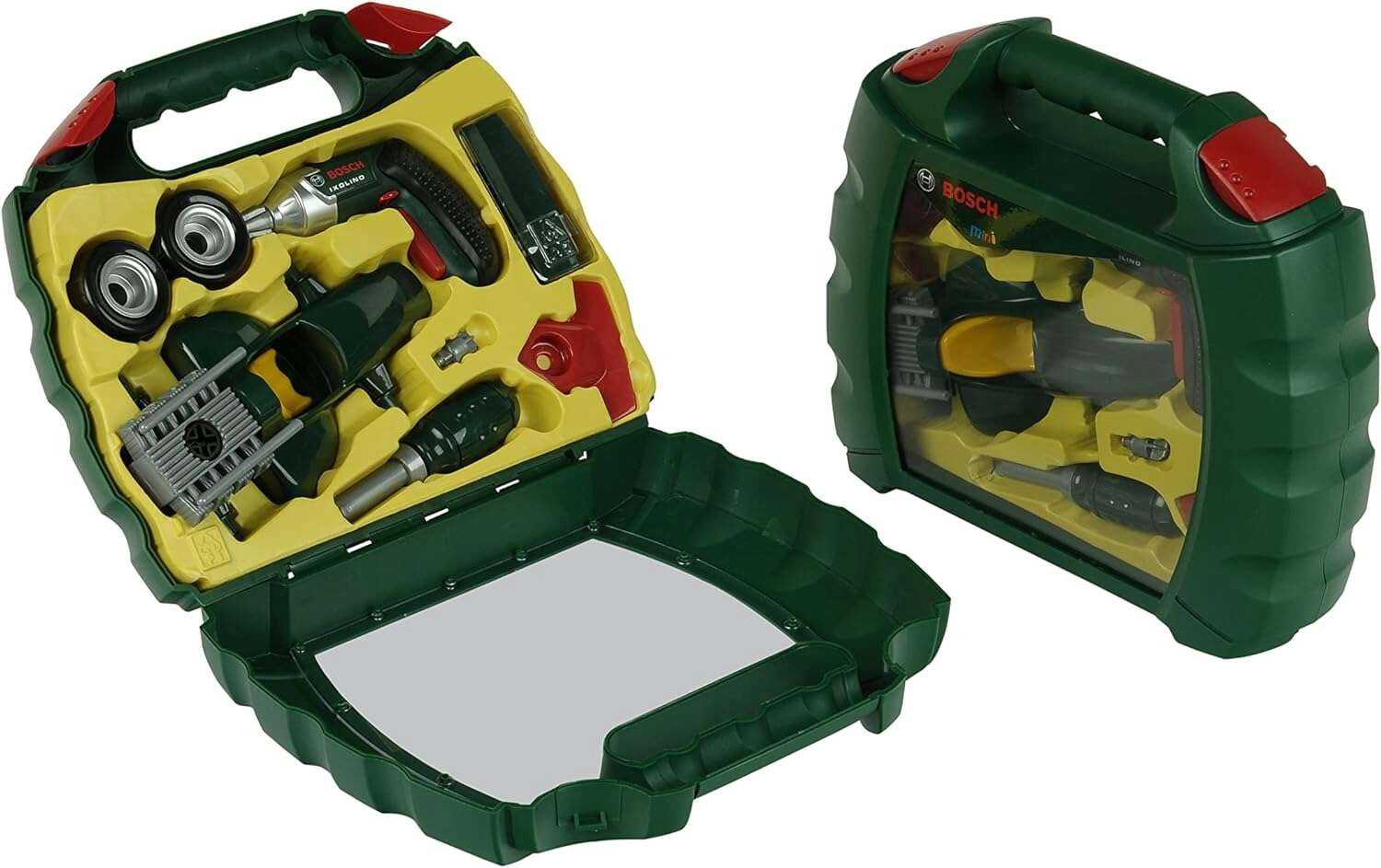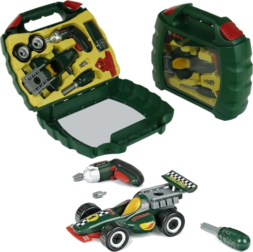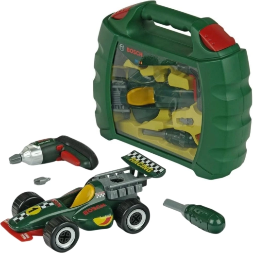 Dieses realistische Set mit BOSCH mini Lizenz enthält den Kinder-Akku-Schrauber Ixolino mit drehbarem Bit und Soundeffekt, einen Schraubendreher, Schrauben und alle Teile zum Bau des dunkelgrünen Rennwagens. Alles ist übersichtlich in einem robusten Kunststoffkoffer mit transparentem Deckel und bequemem Tragegriff verstaut – so kann das Spielzeug überallhin mitgenommen werden.
