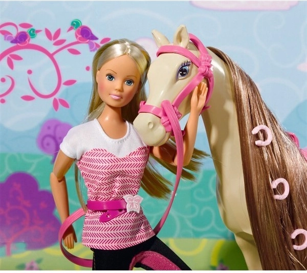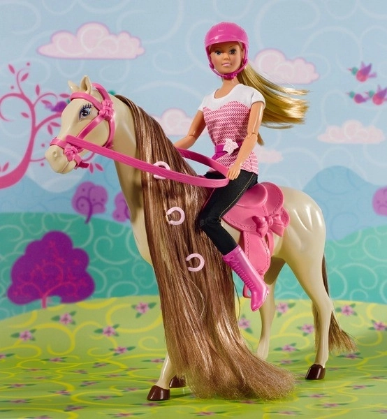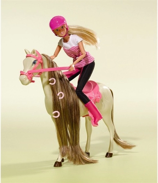 Steffi mit ihrem Pferd im Jockey-Outfit. Das Pferd hat eine sehr lange Mähne, die gekämmt und frisiert werden kann.